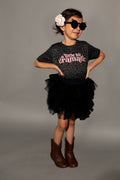 A Little Bit Dramatic’ graphic tee for girls! Rabbit Skin Brand Tee in a fun Dark Grey leopard print. Pair with denim, leggings or a cute tutu!