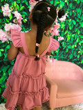 Make a statement in this fabulously fun bubblegum flutter trim tiered dress! Put a little sass in your style with this eye-popping dress that's sure to turn heads-- but don't worry, the tiers will keep them (and your compliments!) rolling in! Don't miss out on this sweet deal! 95% cotton 5% spandex
