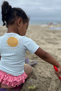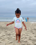 Our toddler rash guard in mint and pink with ruffles and side ties is the perfect choice for a fashionable and functional swimwear option. Let your little one make a splash with confidence and style!