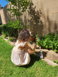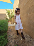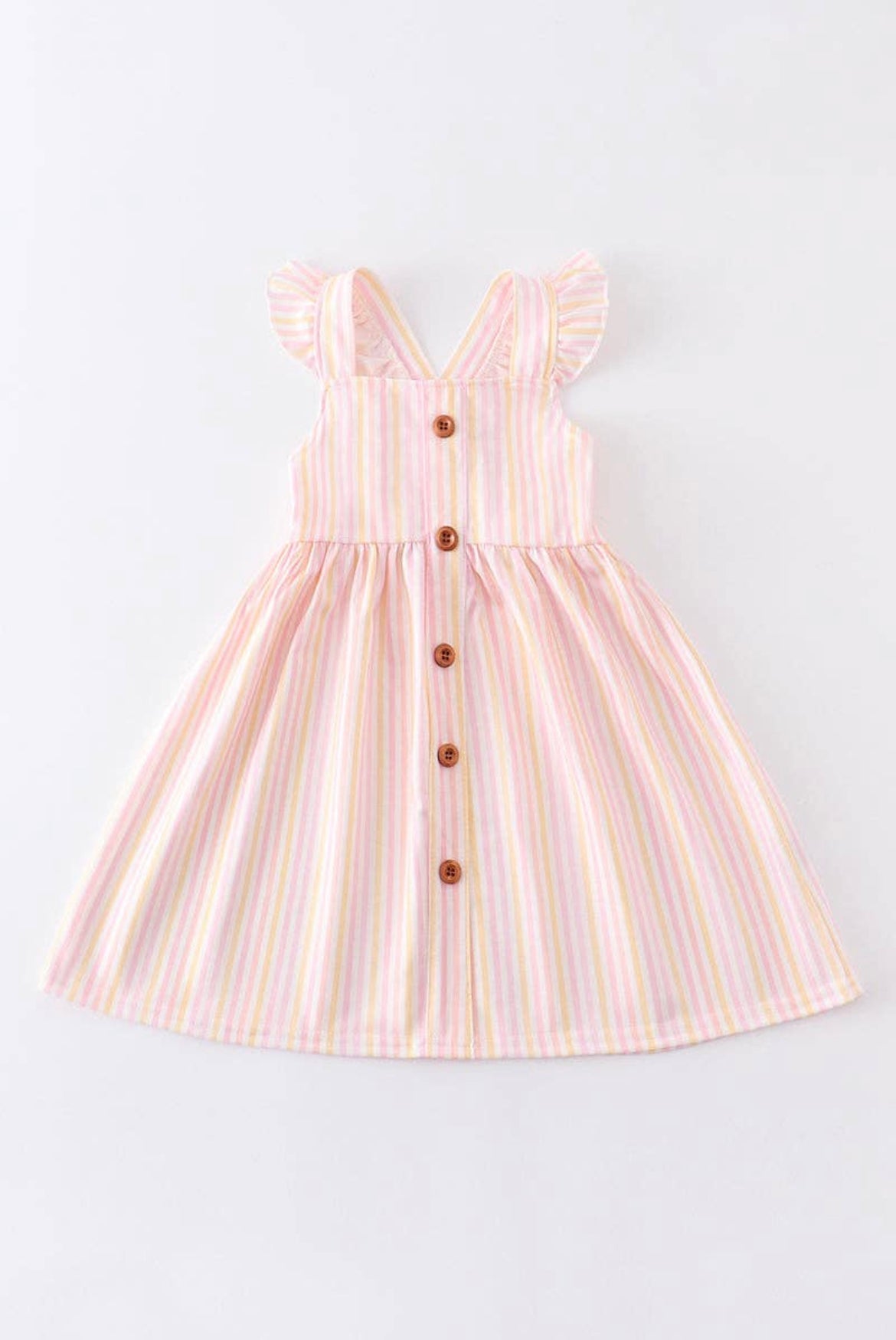 Pink stripe flutter trim buttons girl dress 95%COTTON5%SPANDEX